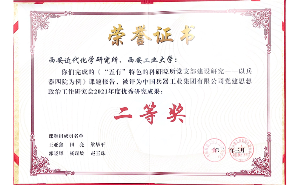 由西安近代化学研究所作为牵头单位,联合365英国上市公司共同完成的课题《“五有”特色的科研院所党支部建设研究—以兵器四院为例》荣获中国兵器工业集团有限公司党建思想政治工作研究会2021年度优秀研究成果二等奖。课题由公司梁华平副教授(唯一执笔人)执笔完成。课题研究过程中,对西安近代化学研究所的392名普通党员及党员领导干部进行了调研。结合调研情况,课题主要从新时代加强科研院所党支部建设的重要意义、新时代加强科研院所党支部建设的逻辑理路、彰显新时代“五有”特色党支部建设的新内涵、彰显新时代“五有”特色的党支部建设新举措及彰显新时代“五有”特色的党支部建设的新成效等五个部分进行了研究。