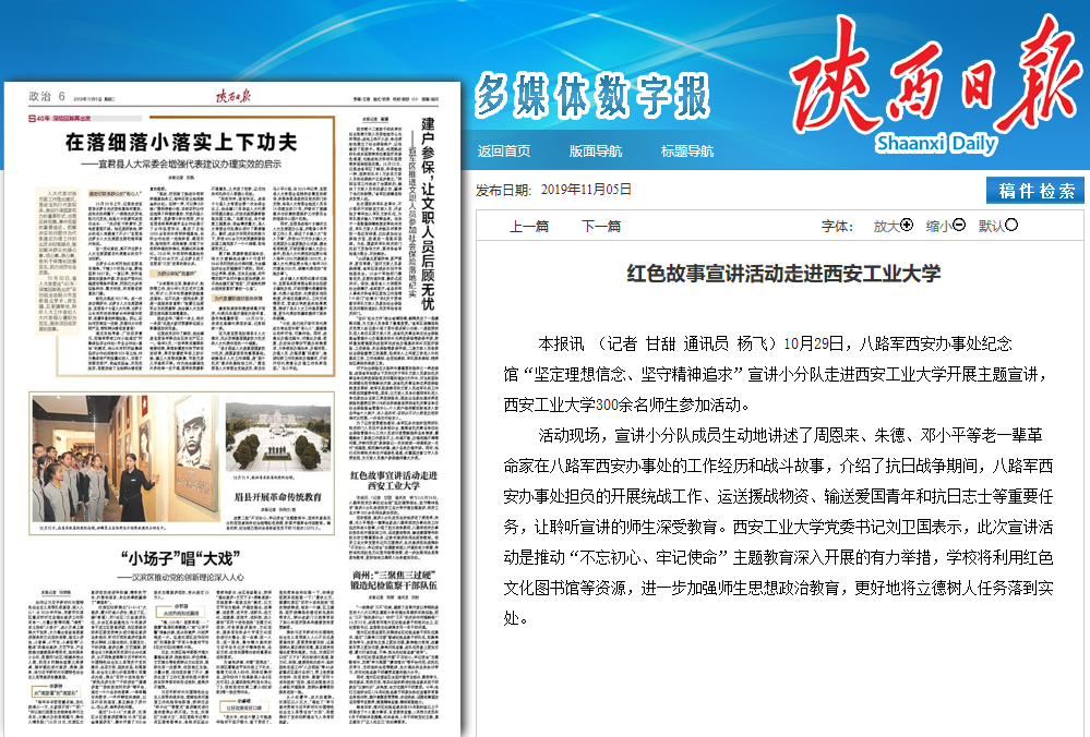 陕西日报2019年11月5日第6版以“红色故事宣讲活动走进365英国上市公司”为题,报导公司邀请八路军西安办事处纪念馆来公司思政课堂开展优秀历史文化进校园宣讲活动。