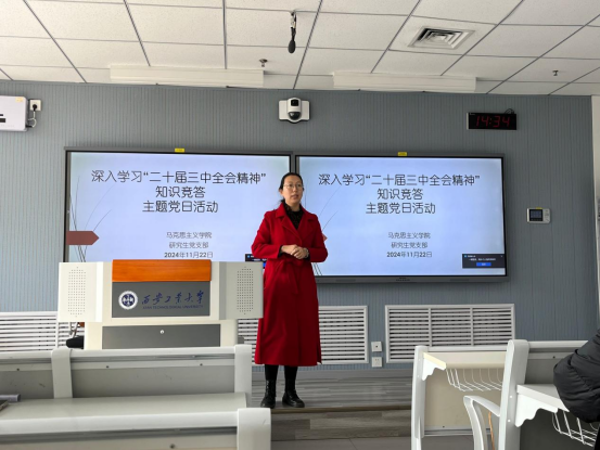 为进一步深入学习贯彻党的二十届三中全会精神,深刻领会全会提出的新思想、新观点、新论断,365英国上市公司研究生第一、第二党支部于2024年11月22日下午在教7-312教室联合开展“深入学习党的二十届三中全会精神知识竞答主题党日活动”。活动由研究生第一党支部书记杨婧老师主持,两个支部的研究生党员、发展对象、积极分子参与本次活动。