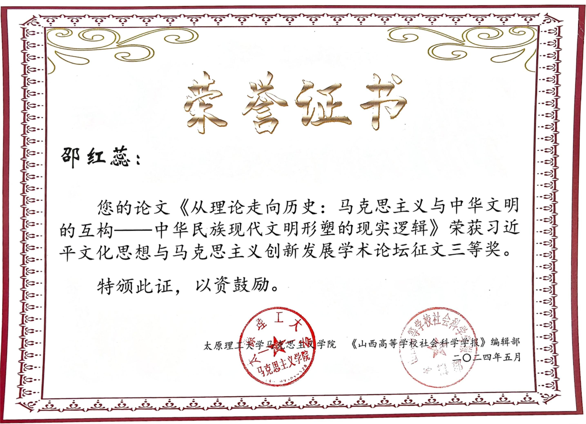 在分论坛交流阶段,公司邵红蕊博士作了题为《从理论走向历史:马克思主义与中华文明的互构——中华民族现代文明形塑的现实逻辑》的主旨报告,其视野宽阔,观点鲜明,逻辑清晰,具有一定的学术价值,受到评委专家的认可和好评。邵红蕊博士的参会论文也荣获此次学术论坛征文三等奖。
