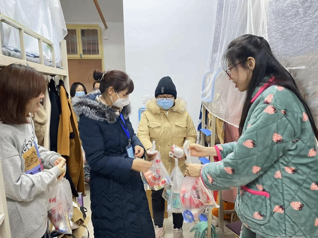 接下来是公司党委副书记李明芳和公司辅导员王亚茹通过在公寓内走访员工,为同学们送来元旦礼物及亲切的问候,并且与同学们一起合影留念来记录这一次特殊的佳节。