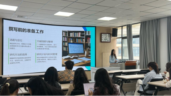 在学术分享环节,冯倩茹从员工视角详细介绍了论文写作的全过程,涵盖选题立意、前期准备、结构逻辑、语言表达及投稿规范等关键环节。她指出,选题应结合个人兴趣与学术热点,兼顾可行性与创新价值;在前期准备中,需广泛搜集文献、选择恰当研究方法、合理规划时间,并注重论文结构的严谨性与逻辑性。她特别强调,学术语言应力求准确、简洁,成稿后需反复打磨,并严格遵循投稿格式要求。此外,她还介绍了三种正规投稿渠道,提醒同学们务必通过官方途径核实信息,精准投递,并根据目标期刊要求调整格式。